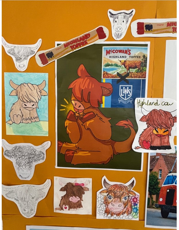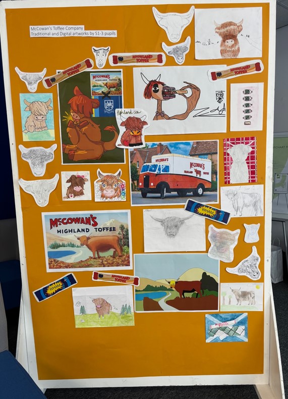 Along with our donation to Larbert High School of the huge tapestry (126 inches long by 97 inches high), a good number of McCowan's toffee boxes and containers, dozens of toffee wrappers, as well as a McCowan mini-Toffee-hammer, a calendar and a large barbecue apron were given to the school for student art projects. It was a great event! Dedicated staff and several dozen keenly active Larbert students -- artists, photographers, videographers, culinary wizards and tech experts -- joined the McCowan contingent and other special guests in this very memorable celebration of a Scottish cultural icon. Four Larbert students were each given nice cash awards for their closely-related literary achievements. There were two winners of the McCowans Highland Cow Limerick Contest. In the Highland Cow category -- Gregor Milne. In the McCowan's Highland Toffee category --Sophie Leadbetter. Ekua Osei, in her final year at Larbert, took a creative writing approach to her award-winning essay submission. Her piece is narrated in the voice of a young cattle herder, Andrew McCowan. An extract here...